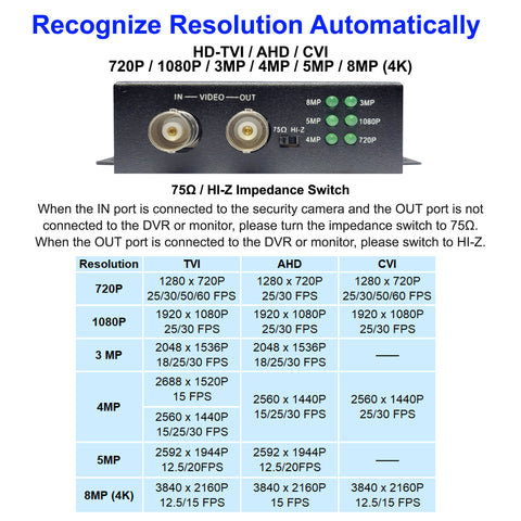 Supports Analog HD TVI/AHD/CVI/Composite V4.0 resolution: HD 720P @25/30/50/60 FPS, HD 1080P @25/30 FPS. 3MP @18/25/30 FPS,4MP @15/25/30 FPS, 5MP @12.5/15 FPS, 4K (8MP) @12.5/15 FPS